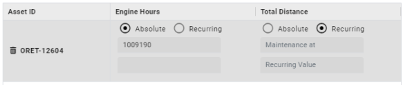 For each asset, select either an absolute or recurring option for Engine Hours and Total Distance, and then specify the values.